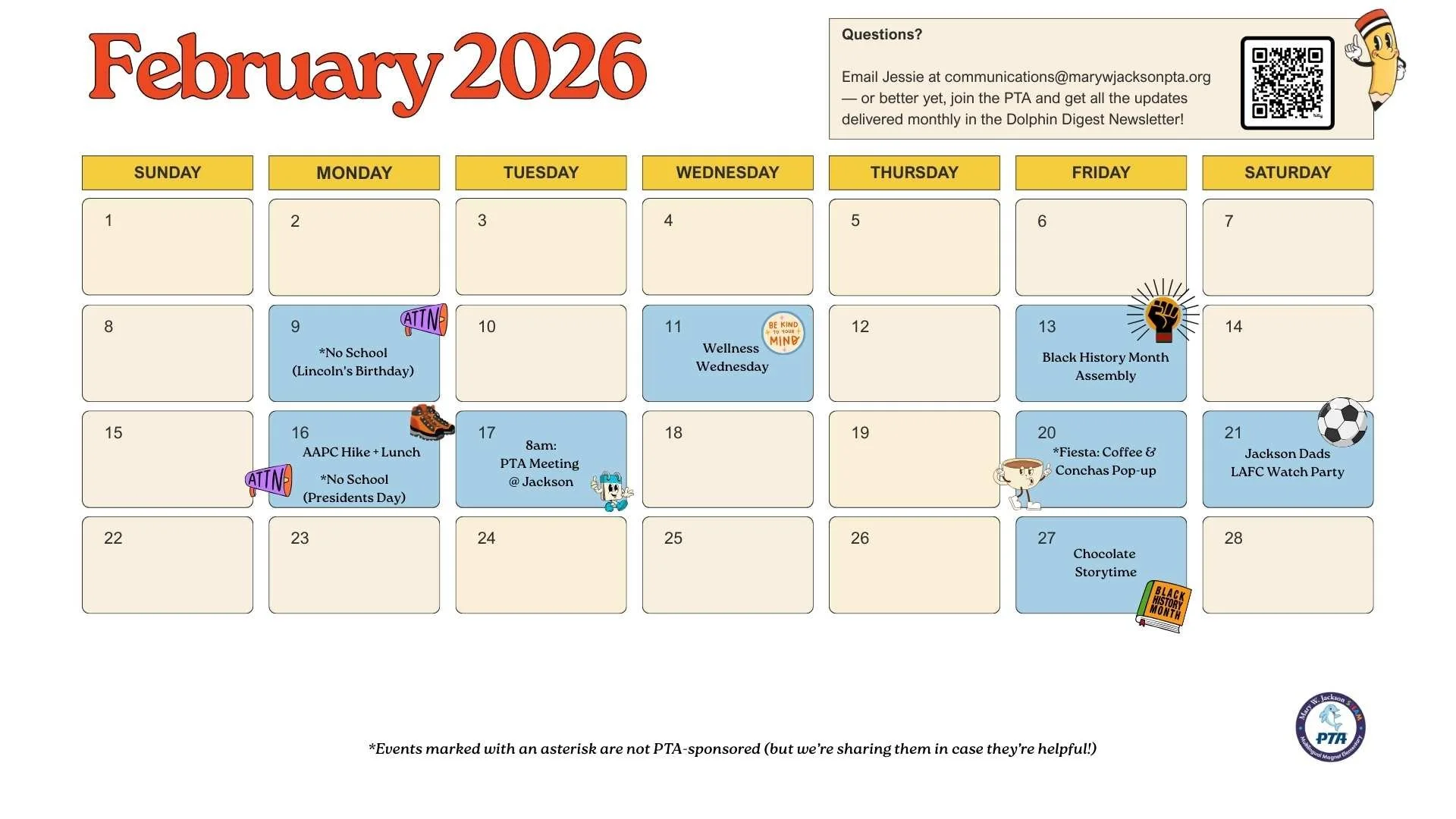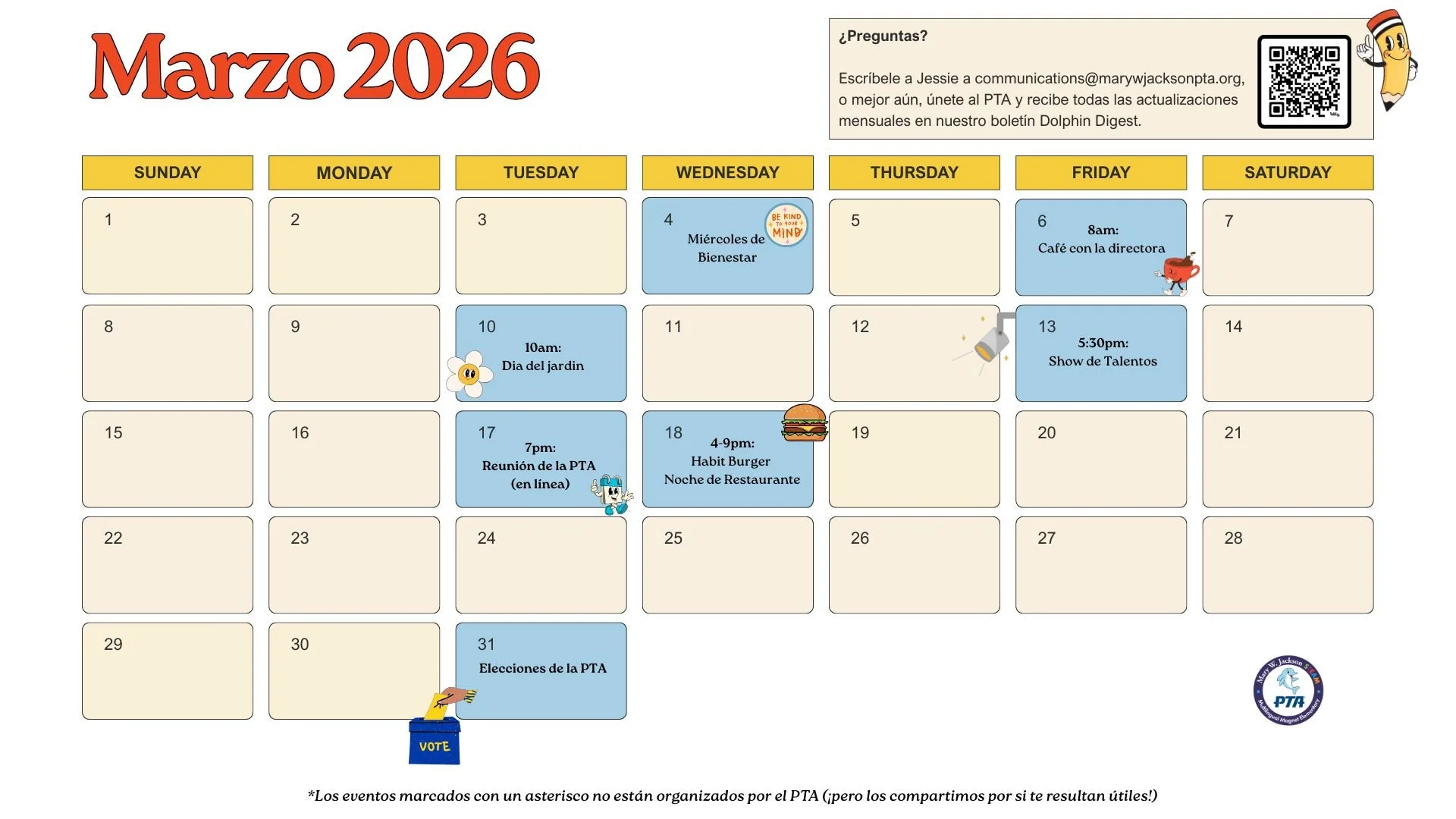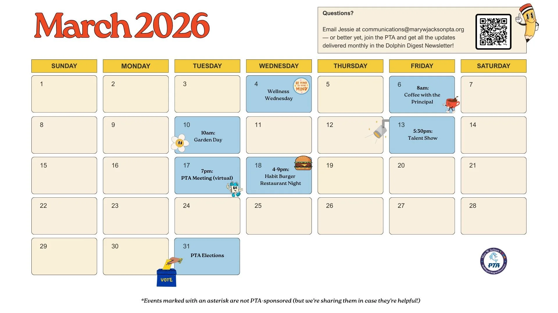 Mark Your Calendars! Looking for event flyers to share or print? Find them all here — available in English and Spanish. Looking for a past event? Browse our archived 2025–26 PTA calendars View Past Calendars Follow the Dolphins! View fullsize View fullsize View fullsize View fullsize Join the fun on Instagram →